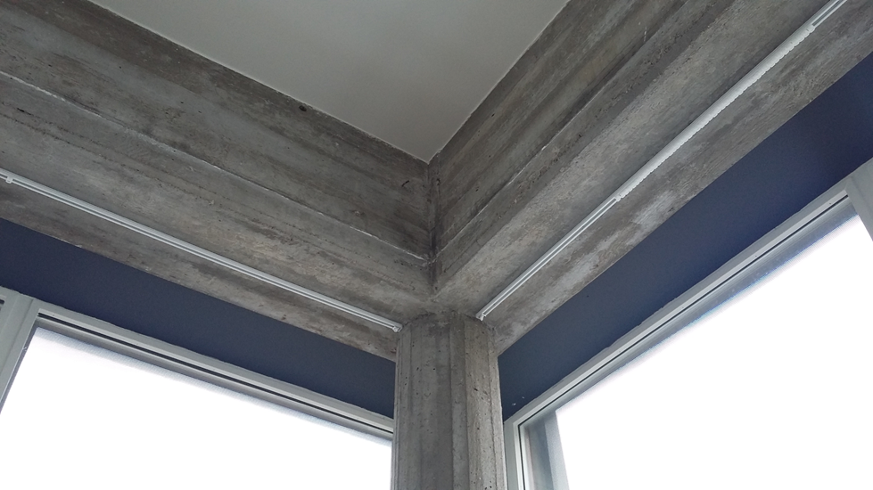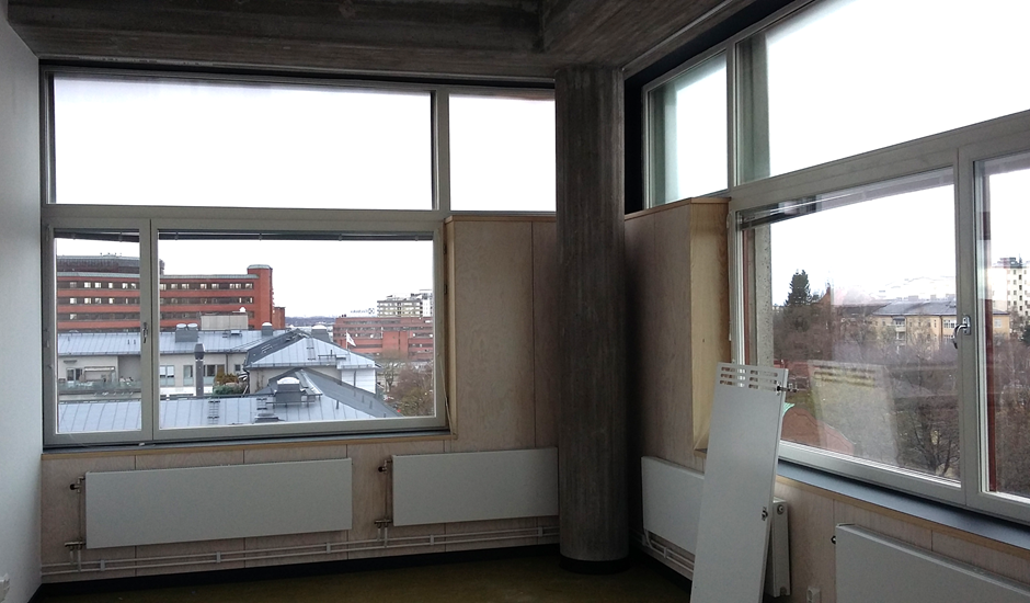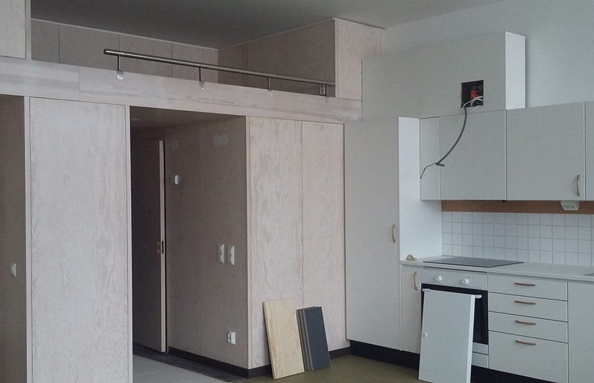 Exempel på studentlägenhet med naken betong mot nya trädetaljer. Foton: G Hedin.