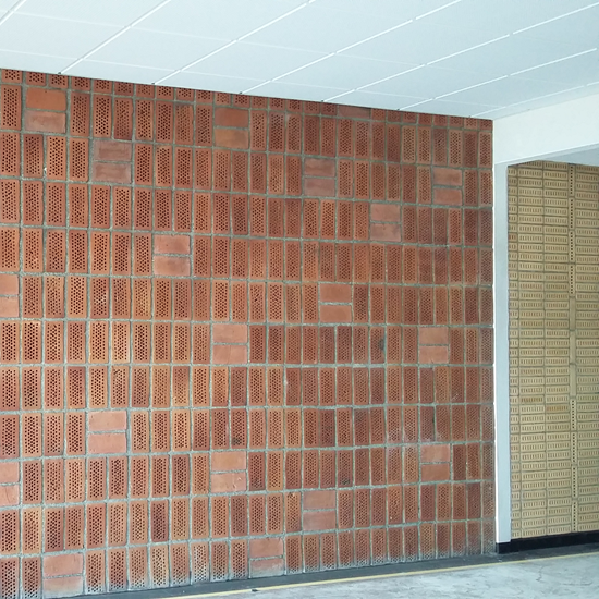 Gemensamhetsutrymme med nakna tegelväggar, gymnastikhall exteriör och interiör.